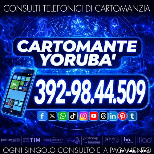 Quindi parlerete solo ed esclusivamente con il Cartomante YORUBA'. Non svolgo consulenze esoteriche via mail, via sms o via whatsapp! Niente consulti con minori e non daro' risposte a domande sulla salute. Potete chiamare tutti i giorni, anche nei festivi, dalle ore 9 fino alle ore 21. I consulti telefonici di Yoruba' durano al massimo mezz'ora.