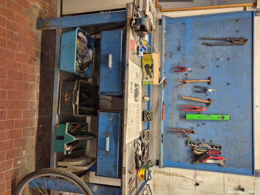 Vendo tavolo da lavoro usag 150cm x 60cm con rastrelliera e ganci per attrezzi, possibilità di fissaggio a terra €100,00. Tel 327 2291661