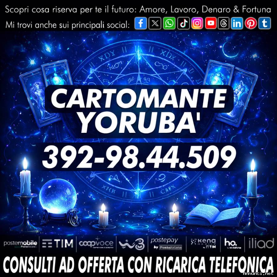 Servizio telefonico di Cartomanzia prepagato con offerta libera ricarica (KENAMOBILE, POSTEMOBILE, TIM, ILIAD, SPUSU, VERY, VODAFONE, COOPVOCE, ecc...).