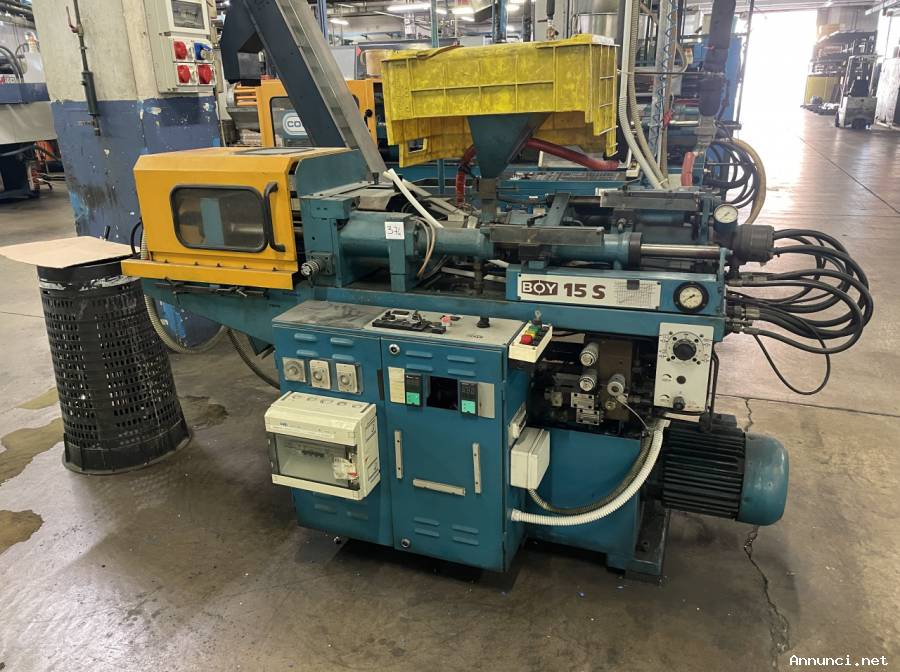Lotto costituito da n. 1 pressa oleodinamica per stampaggio Boy mod. 15S (ID 374), n. 1 pressa oleodinamica per stampaggio Boy mod. 50 T" (ID 375), nastro trasportatore (ID 376) e tramoggia (ID 377).