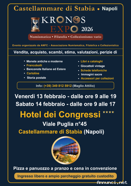 ANFC – Associazione Numismatica, Filatelica e Collezionistica presenta KRONOS EXPO 2026, l’appuntamento dedicato alla numismatica, filatelia, cartamoneta, cartofilia, storia postale, libri, schede telefoniche e oggetti da collezione.