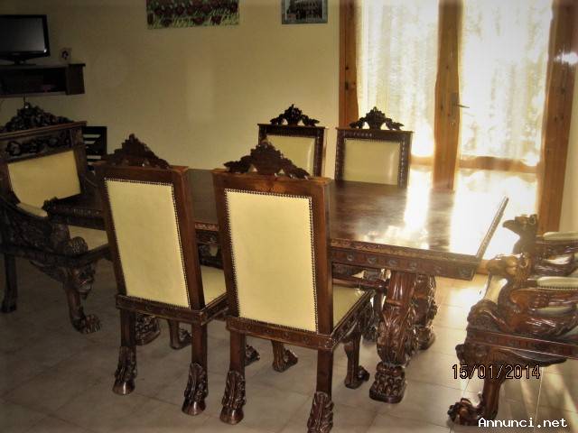 Tavolo con 4 sedie e 2 poltrone imbottite con vera pelle di ottima qualità , pezzi sapientemente scolpiti a mano con motivi unici nel loro genere . Sono presenti segni dovuti dal tempo che conferiscono un fascino ancora maggiore al mobilio .