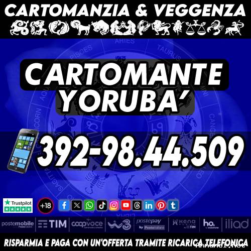 Effettuo consulti di Cartomanzia approfonditi tramite il numero di cellulare presente nella foto in allegato in questa pagina. Chiama tutti i giorni dalle ore 9 alle 21 in orario continuato. Il servizio viene svolto a fronte di un'offerta libera con ricarica telefonica (POSTEMOBILE, TIM, ILIAD, HO, VERY, VODAFONE, COOPVOCE, ecc...). Letture dei Tarocchi su specifiche domande entro 30 minuti di tempo. Cartomanzia a basso costo con il Cartomante Yorubà.