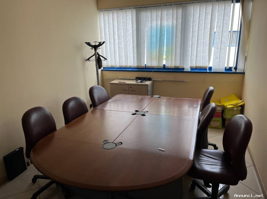 P1 UFFICIO B - n. 1 tavolo riunioni marrone scuro con top in legno, n. 6 poltrone simil pelle amaranto, n. 1 mobile basso a due ante in legno chiaro, n. 1 cassettiera sottopensile in metallo con quattro cassetti e rotelle, n. 1 piantana appendi abiti grigia;