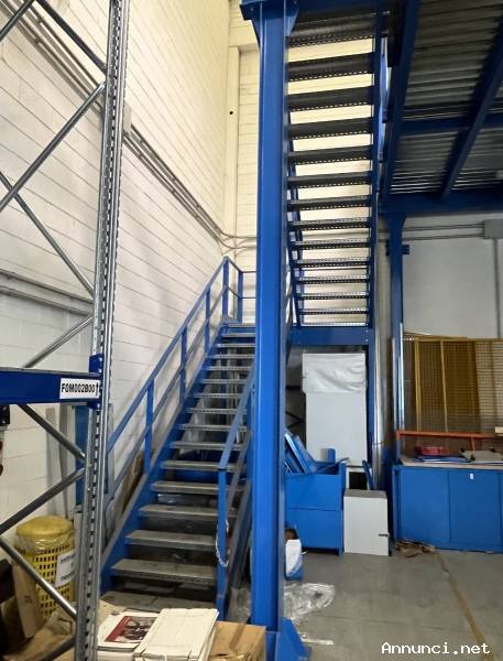LOTTO Q - struttura soppalco con piano 11,4x5,35 completo di scala in ferro due rampe (16 alzate, pianerottolo, 14 alzate) largh. rampa 1 m con parapetto. struttura portante con 6 piantane in profilati d'acciaio, h sotto soppalco 5 m (sotto trave);