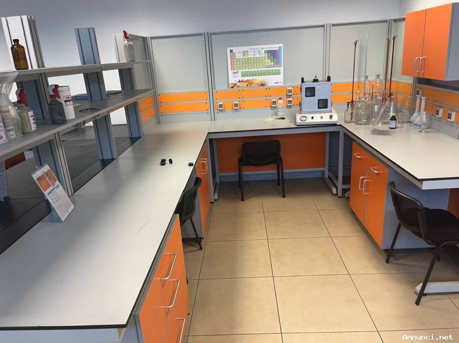 LOTTO T - lotto arredo composto da: n. 1 banco laboratorio con piano in trespa, cassettiera sotto pensile con due cassetti e due ante, schienali attrezzati, pensile a due ante, sottopensile a due ante e sotto pensile a due cassetti sviluppo ad "U" lungh 3m+3m+1,82m+3,90m+2,53m (mobili arancio e grigi), n. 3 sottopensili mono anta grigi su ruote, n. 1 sottopensile arancio monoanta su ruote, n. 1 tavolo in acciaio 120x60, n. 8 sedie in tessuto nero, n. 2 banchi laboratorio con top in trespa sviluppo 2,70 con pareti attrezzate, sottopensile con ruote monoanta grigio e sottopensile su ruote con due cassetti.