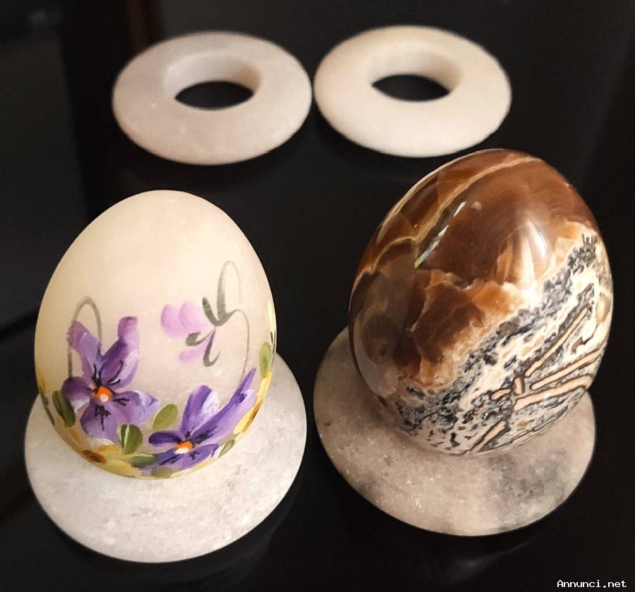 Un uovo in marmo ed un'altro in alabastro decorato, ognuno con il suo supporto dedicato, come ricambio per quello in alabastro altri 2 supporti. Oggetti anni-70-80 nuovi, mai utilizzati, provenienza Volterra. Dimensioni: Uovo in marmo, altezza bon basamento mm 70 circa, diametro max. mm 47 circa - Uovo in alabastro decorato, altezza con basamento mm 60 circa, diametro max. mm 44 circa - Basamento, diametro mm 58 circa, con spessore di 11mm circa.