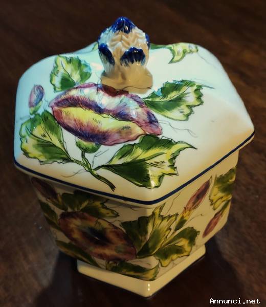 Vaso del produttore Michielotto, decorato a mano, come riportato dai timbri presenti sul fondo dello stesso. Di forma esagonale, in perfette condizioni di conservazione, senza segni o sbeccature. Dimensioni: diametro max. cm 18,5 circa, altezza max. cm 25,3 circa.