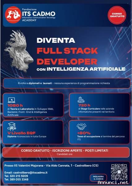 Iscriviti al corso gratuito per Software Developer dell'ITS Cadmo Academy di Castrolibero (CS) e acquisisci competenze molto richieste nel settore tecnologico.