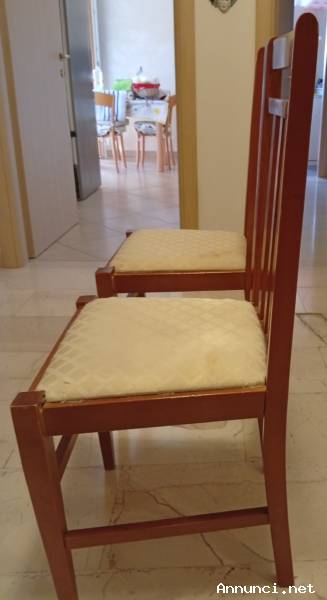 Coppia di sedie in legno con seduta imbottita, molto usate ma stabili e da sfruttare, da cucina o sala da pranzo.