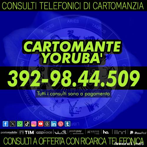 Ci sono dei momenti nella nostra vita in cui abbiamo bisogno di un supporto per riuscire a superare dilemmi, dubbi e perplessità. Con un consulto telefonico di Cartomanzia puoi fugare ogni dubbio che ti attanaglia, ogni perplessità che ti crea consusione e ogni dubbio che non ti permette di vivere bene. Yoruba' ti parlerà con molta semplicità per fare chiarezza dentro di te. Grazie ai Tarocchi e alla mia sensitività sarò in grando di determinare che cosa ti aspetta per il presente e per il futuro. Tutti i miei consulti sono a pagamento con una formula molto semplice: infatti ti chiederò di donare una ricarica telefonica secondo le modalità che ti riferirò telefonicamente. In questo modo tu rimani anonimo!