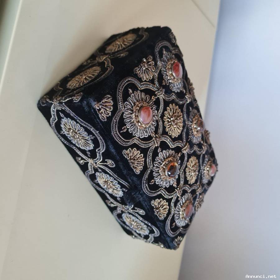 Antico portagioie anglo-indiano in velluto cinigliato nero con ricami in filo dorato e perle di corniola e ambra dimensioni c.m . 15x9x6 .Ottime condizioni .Vendo a € 118. Gradito contatto telefonico wapp . Cell.3478314154