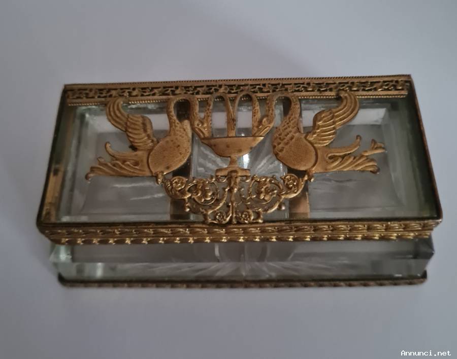 Antico cofanetto da scrivania stile Impero porta timbri / francobolli, realizzato in cristallo molato con inserti in bronzo dorato . La base con n° 3 scomparti .Dimensioni cm .10,5 x cm .5,5 x cm . 3,7. In ottimo stato come da foto. Vendo a € 238. Gradito contatto telefonico wapp . Cell.3478314154