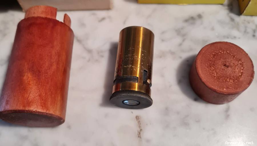 Microscopio d'epoca da tasca in ottone laccato , custodia in legno , funzionante presenta i caratteristici segni del tempo e dell'usura, come da foto . In dotazione n° 2 scatole di vetrini preparati relativi a peli animali e fibre tessili . Messa a fuoco regolabile a vite . Dimensioni: altezza cm .4,7 diametro cm .2,5. Vendo € 88 . Gradito contatto telefonico cel.347 8314154