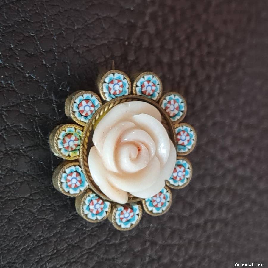 Spilla antica tema floreale primi '900 micromosaico , inserto centrale rosa realizzato in corallo rosa pelle d’angelo .Tutte le tessere sono presenti. Nessuna crepa . Lunghezza totale cm .2 5 altezza cm .0,9. Vendo a € 118. Gradito contatto telefonico wapp . Cell.3478314154