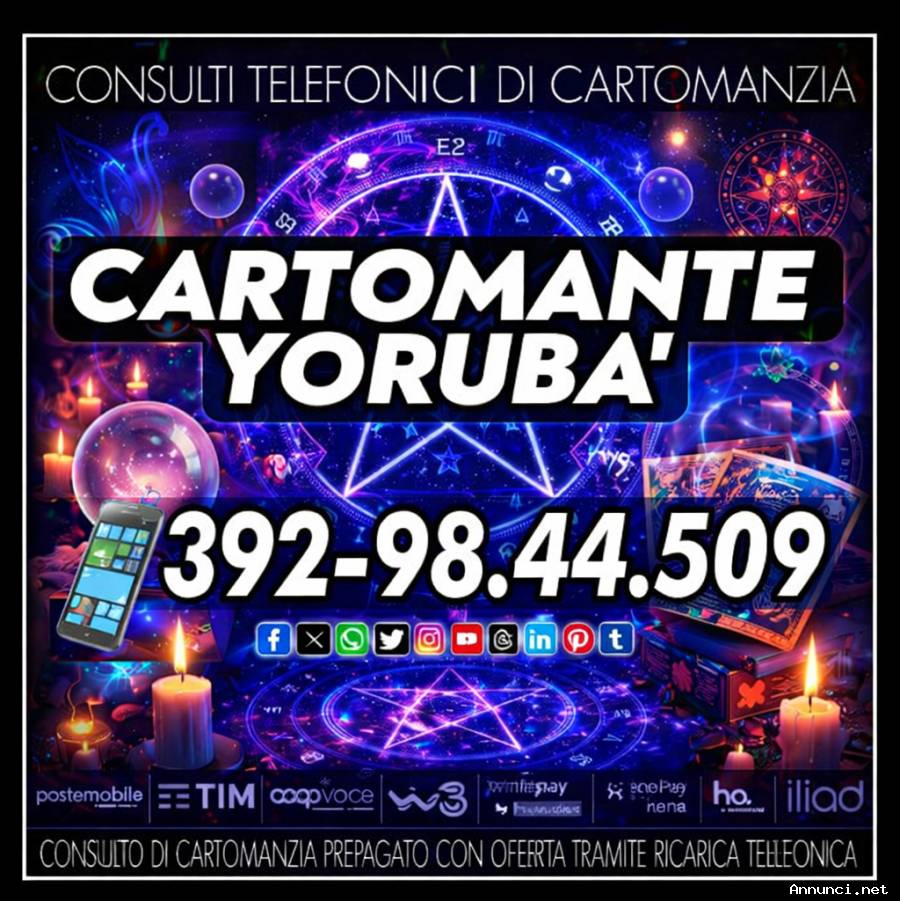 Esperto Cartomante Sensitivo offre la possibilità di un consulto di Cartomanzia di 30 minuti. Puoi chiamare il numero di cellulare che visualizzi in una delle foto presenti in questo annuncio per richiedere un consulto serio ed approfondito. Svolgo da oltre 25 anni consulenze esoteriche, garantisco la massima riservatezza e il piu' assoluto anonimato nello svolgimento del consulto. Chiama tutti i giorni dalle ore 9 alle 21 (orario continuato). Chiama e prenota un consulto. La semplice chiamata, anche per ricevere maggiori informazioni, non è assolutamente impegnativa. Interroga i Tarocchi di Yoruba': ritorni sentimentali, negatività in generale, affari, famiglia, lavoro...e tutto cio' che riguarda il mondo dell'occulto. Il servizio di Cartomanzia viene svolto a fronte di un'offerta libera con una ricarica telefonica (TIM/WIND/COOPVOCE/ILIAD/KENAMOBILE/HOMOBILE/POSTEMOBILE) o ricarica POSTEPAY/AMAZON.