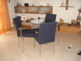 Dimensioni tavolo triangolare: lato 125 cm. Spessore del cristallo: 1,2 cm. Piedi del tavolo in metallo cromato.