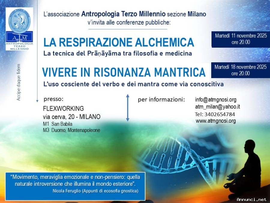 L'associazione Antropologia terzo millennio (sezione Milano) vi invita alle conferenze pubbliche: LA RESPIRAZIONE ALCHEMICA la tecnica del pranayama tra filosofia e medicina. martedi 11 novembre 2025 ore 20:00 VIVERE IN RISONANZA MANTRICA L'uso cosciente del verbo e del mantra come via conoscitiva Martedì 18 novembre 2025 ore 20:00 Presso: FLEXWORKING via cerva, 20 M1 san babila M3 duomo - Montenapoleone Per informazioni: Info@atmgnosi.org atm_milan@yahoo.it Tel. 3402654784 www.atmgnosi.org