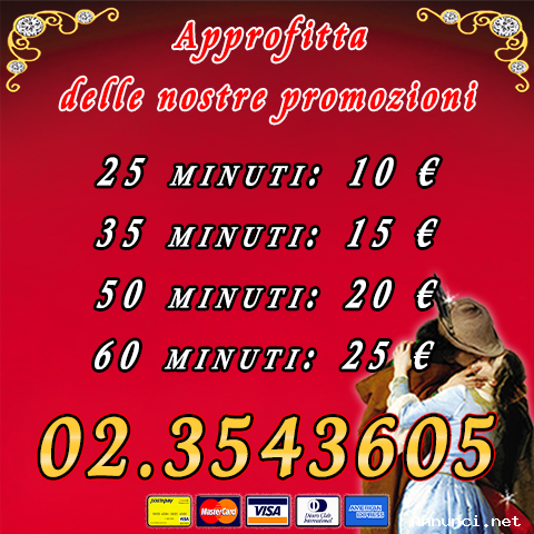 Per avere certezze nel presente, può essere necessario dare uno sguardo sul futuro! Approfitta delle nostre promozioni e chiamaci con fiducia allo 023543605. Puoi pagare con una ricarica sulla nostra postepay, oppure con la tua carta di credito, e potrai farci tutte le domande che ti stanno a cuore su amore, fortuna, o lavoro. I nostri cartomanti sensitivi sapranno aiutarti, rispondendoti con sincerità e fornendoti i consigli giusti. Ti aspettiamo da lunedì a venerdì, dalle 9 alle 20. A presto