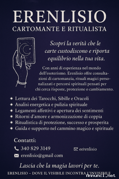Con anni di esperienza nel mondo dell’esoterismo, Erenlisio offre consultazioni di cartomanzia, rituali magici personalizzati e percorsi spirituali pensati per chi cerca risposte, protezione o cambiamento.
