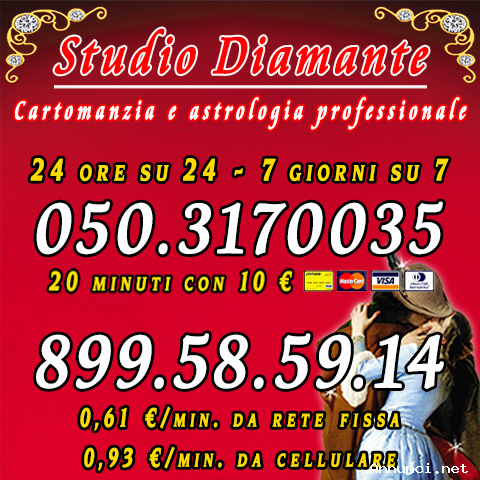 Cartomanti sensitive, esperte e professionali, ti aspettano per rispondere con sincerità alle tue domande su amore, fortuna, o lavoro. Se desideri pagare con la tua tua carta di credito, in totale sicurezza e anonimato, puoi contattarci allo 0503170035, altrimenti puoi chiamarci all’899585914. Siamo a tua disposizione 24 ore su 24, 7 giorni su 7, per gettare con te uno sguardo sul futuro e darti certezze nel presente! A presto