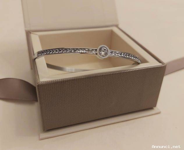 Bracciale donna rigido chiusura a scatto, acciaio( steel ), con piccoli zirconi inseriti a binario in mezzo bracciale e pietra centrale più grossa taglio brillante.