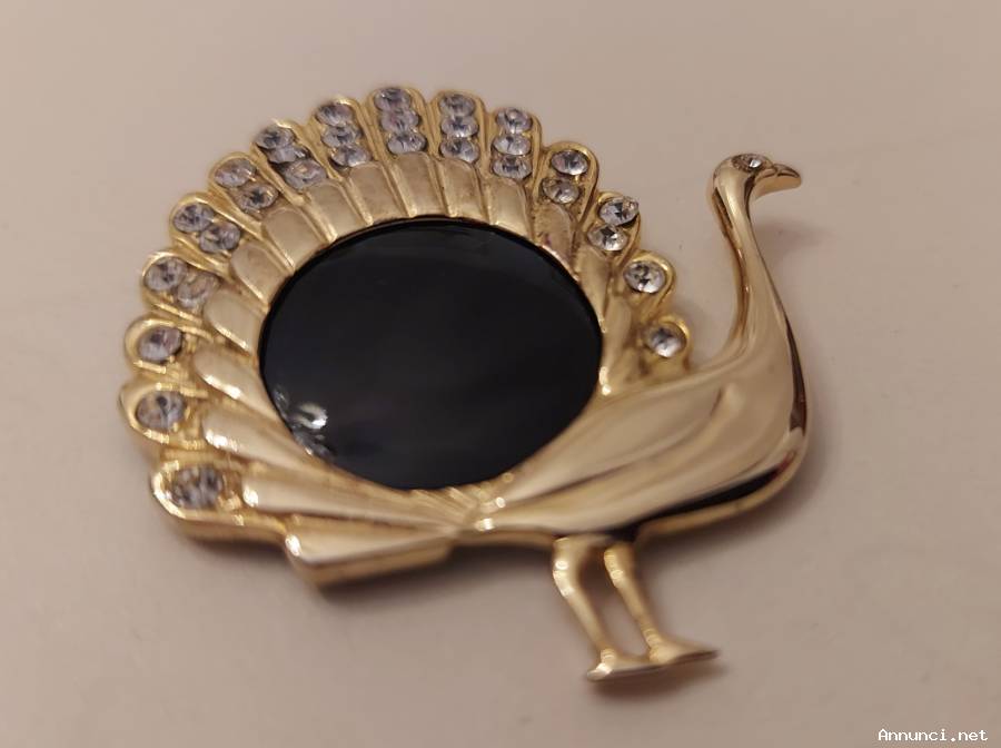 Centrale in argento dorato 800( punzonato), per uno o due fili di collana, a forma di pavone con onice nero incastonato nel corpo, e strass incastonati nella coda. Sul retro quattro anellini per poter posizionare un filo o doppio di collane a fantasia. Oggetto anni 90, che fa parte di magazzino di un negozio chiuso.