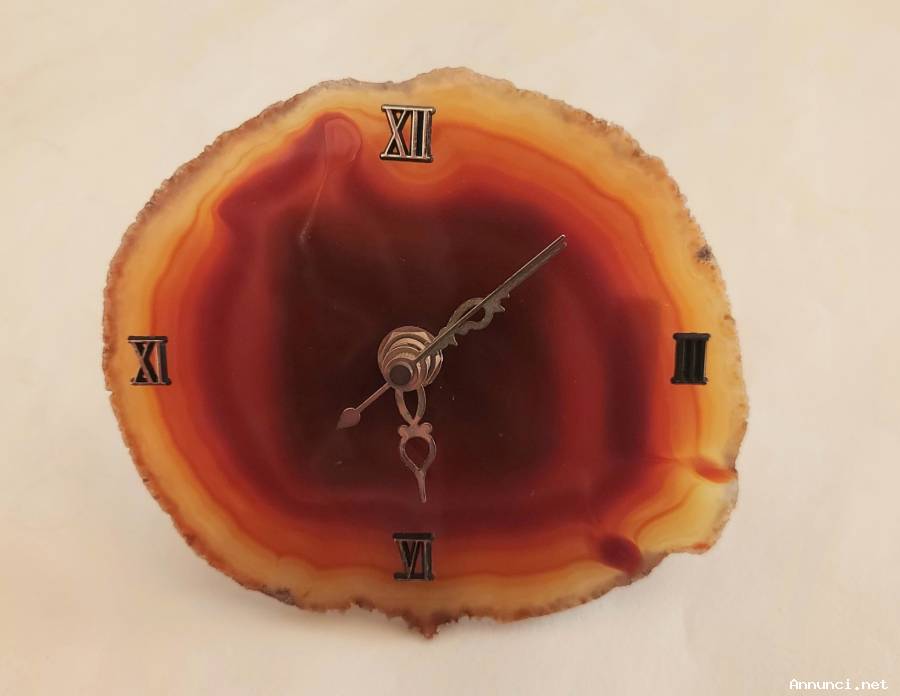 Fetta di agata striata dai colori caldi del marrone e dalla forma tondeggiante proveniente dal Brasile. Forata nella quale c'è stato incastonato il meccanismo dell'orologio. Pietra porta fortuna per eccellenza. Dona energia e migliora il benessere interiore.