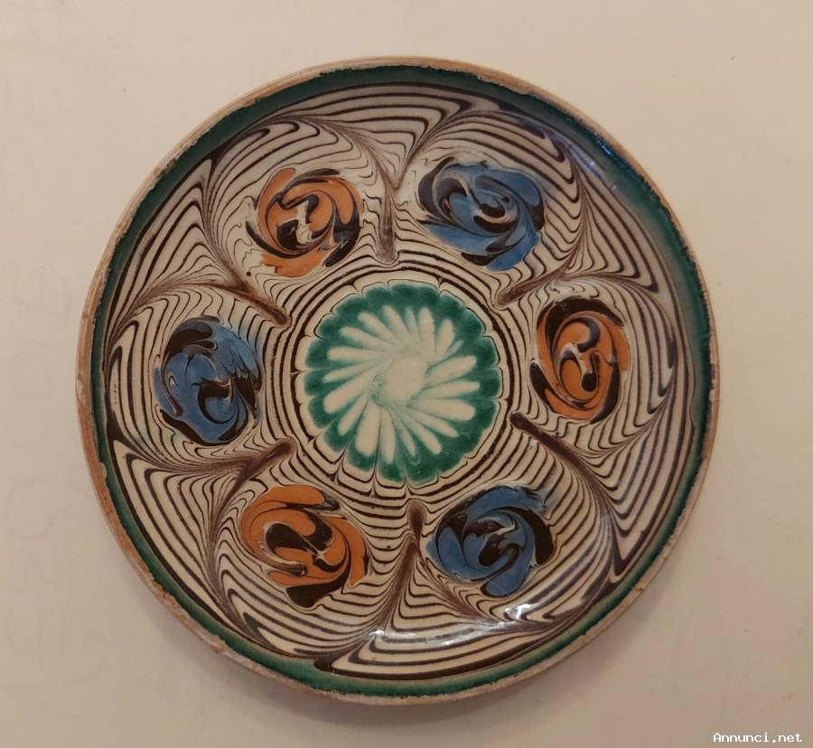 Piatto in ceramica dipinto a mano, realizzato e prodotto nel cuore dell'Italia; a Deruta, un piccolo comune in provincia di Perugia e il cui artigianato si riconosce interamente nella produzione di maioliche. La ceramica di Deruta è nota in tutto il mondo e la sua storia ha radici antiche che affondano nel Basso Medioevo, e da allora la produzione di ceramiche ha sempre influenzato fortemente l’economia della città. Il pezzo presenta un decoro caratteristico conosciuto come uno dei decori più classici della tradizione derutese caratterizzato da girali fioriti tratti da piatti rinascimentali.