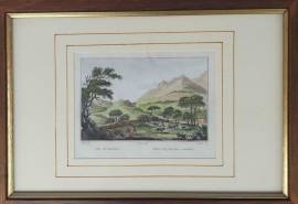 Trittico di 3 vecchie stampe con cornice in legno di noce rifinite con passepartout, vetro e gancio triangolare sul retro per poterle appendere.