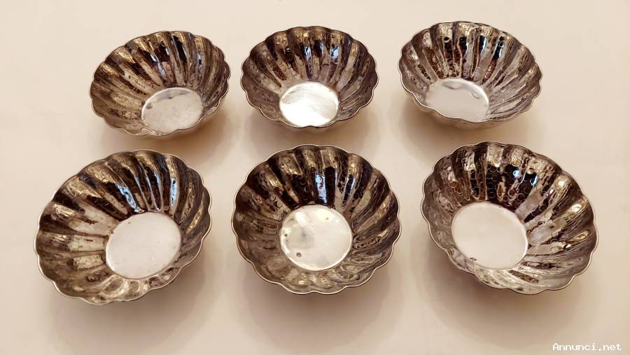 6 ciotole tonde in silver plated, anni 80, lavorazione tipo petali, balzati all' interno, bordino di rifinitura e fondo tondo liscio.