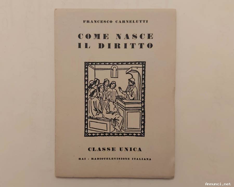 Come nasce il diritto" di Francesco Carnelutti (Edizioni Radio Italiana, 1954, 58 pp.) è il primo volume della collana "Classe Unica". Si tratta di un'opera divulgativa in cui il noto giurista spiega l'origine del diritto come strumento per regolare i conflitti e la convivenza umana, partendo da basi semplici.