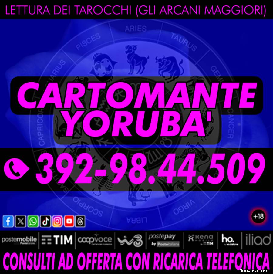 Un consulto di Cartomanzia di qualità serio e professionale. 30 minuti di tempo per rispondere alle tue domande. Chiama il numero di telefono che puoi visualizzare nella foto in questa pagina. Il servizio è attivo tutti i giorni in orario continuato dalle ore 9 alle 21. Pagamento con offerta libera tramite ricarica telefonica (TIM/WIND/COOPVOCE/ILIAD/KENAMOBILE/HOMOBILE/POSTEMOBILE) o ricarica POSTEPAY/AMAZON. Cartomante Yoruba.