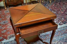 Antico tavolino da gioco in mogano stile inglese Vittoriano del 900 con apertura a fazzoletto dove all’interno troviamo un panno verde e scodelline porta fiches.