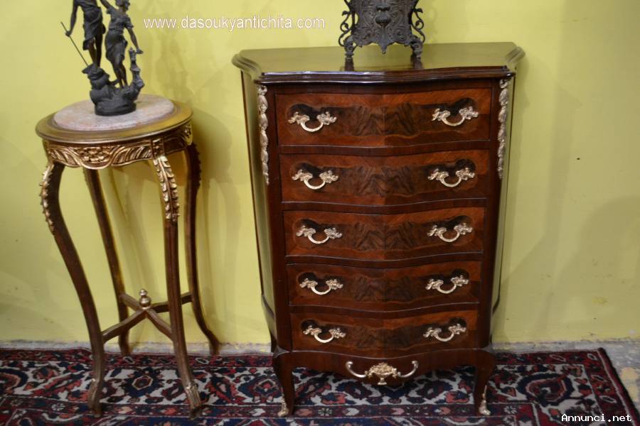 Cassettiera-cinquino in stile Luigi XV , mosso su fronte e fianchi, legno massello lastronato in bois de rose , noce e radica, provvisto di cinque cassetti di buona capacità dotati di maniglie in bronzo cesellato e dorato che ritroviamo nei fianchi e nella parte inferiore del mobile e sulle gambe.