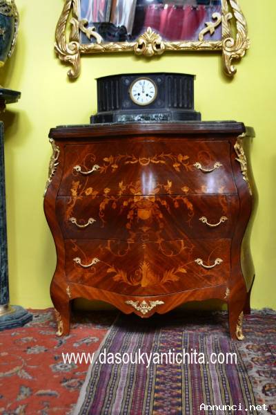 Comò stile Luigi XV Rococò in noce massello , lastronato in radica riccamente decorato da intarsi floreali e vegetali in legni pregiati ( bois de rose, acero, legni di frutto ,palissandro ) .