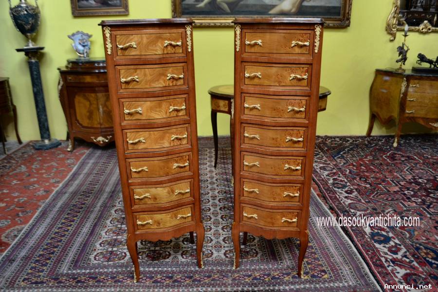 Coppia di settimini-cassettiere in stile Luigi XV in noce, caratterizzate da un design elegante, frontali leggermente bombati in legno massello e in noce e radica, rifiniti da maniglie e applicazioni in bronzo dorato