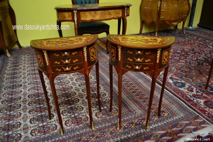 Coppia di tavolini-comodini mezzo stile Luigi XV , dotati di tre cassetti , impiallacciati in noce , bois de rose , acero e legni da frutto a motivi floreali e geometrici, gambe sottili e leggermente affusolate, che conferiscono un senso di leggerezza ed eleganza.