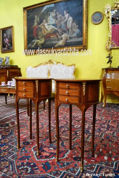 Deliziosa coppia di tavolini-comodini ovali in stile Luigi XV in noce , lastronati in noce e radica e filettature in acero , provvisti di tre cassetti, gambe arcuate, applicazioni in bronzo cesellato e dorato.