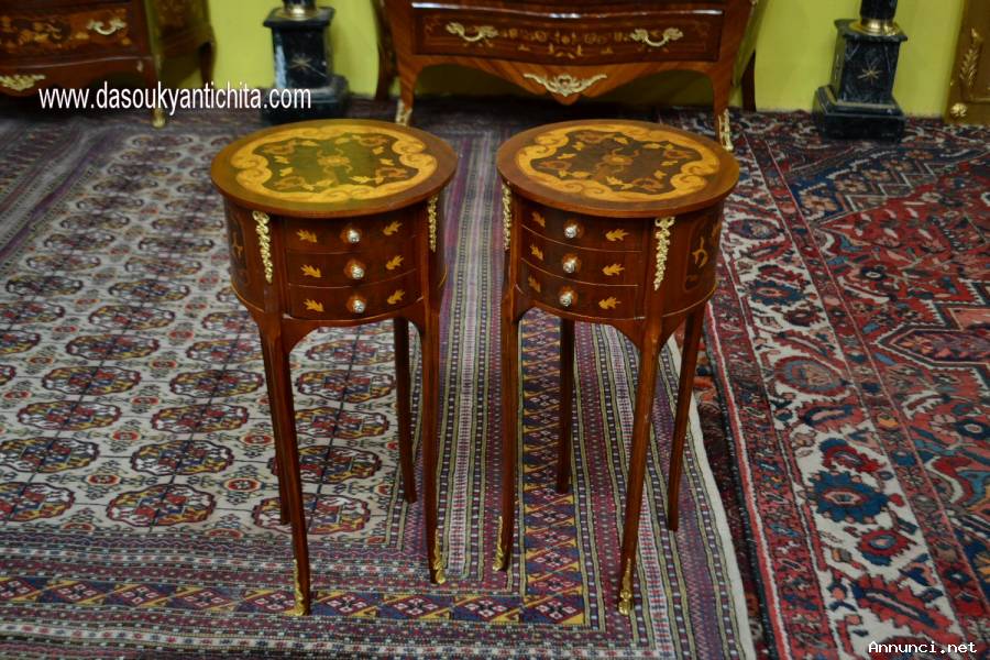 Coppia di tavolini-comodini tondi stile Luigi XV , dotati di tre cassetti , impiallacciati in noce , bois de rose , acero e legni da frutto a motivi floreali e geometrici, gambe sottili e leggermente affusolate, che conferiscono un senso di leggerezza ed eleganza.