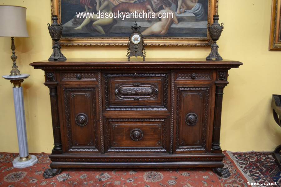 Imponente credenza in stile Neorinascimento del XX secolo in noce massello, presenta varie sezioni del mobile delineate da cornici e modanature intagliate a motivo fogliaceo aggiungendo profondità e definizione alla struttura complessiva, elaborati intagli a rilievo di teste di