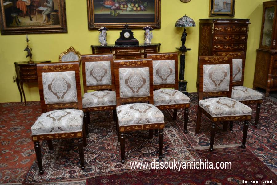 Elegante gruppo di sei sedie-poltrone stile olandese in noce, con intarsi in legni policromi, gambe tornite e scanalate, schienale e seduta imbottite e foderate in tessuto damascato.