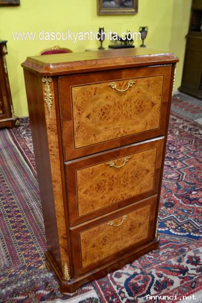 Scarpiera a tre ripiani a ribalta, in stile Napoleone III in noce e impiallacciata in radica con filettature in acero , rifinita da applicazioni in bronzo cesellato e dorato.
