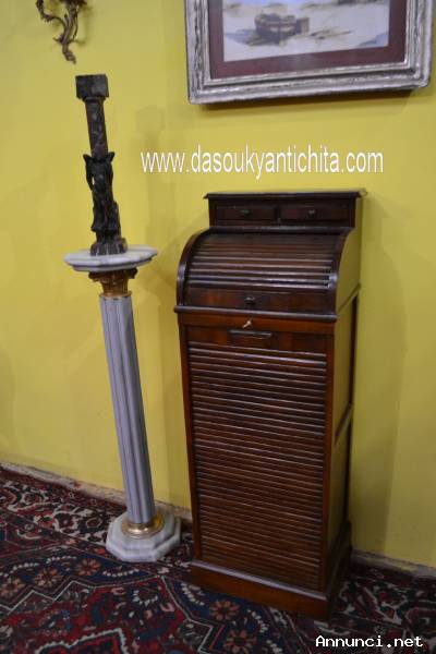 Parte superiore con apertura a rullo dove all’interno si celano quattro cassetti e un piccolo piano di scrittura.