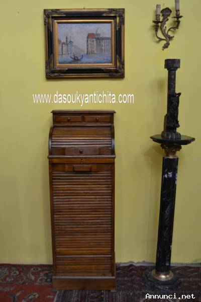 Parte superiore con apertura a rullo dove all’interno si celano quattro cassetti e un piccolo piano di scrittura.