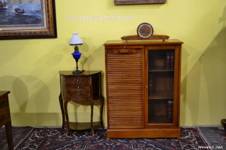 Dimensioni : Larghezza 88 cm. Profondità 40 cm. Altezza 117 cm. ( ripiani lato vetrina L. 40 x P. 29 x H. 33 ) ( dimensioni cassetti L.37 x P.26 x H.7 )