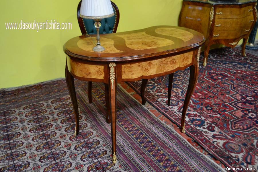 Elegante scrittoio stile Luigi XV a forma di fagiolo ideale per essere posizionato al centro di una stanza. in noce massello , lastronata in noce e radica di betulla, dotata di tre cassetti frontali, rifinita da applicazioni in bronzo cesellato e dorato.