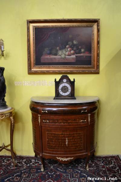 Credenza- servante stile Luigi XV a mezzo giro provvista di due sportelli e due sportelli frontali, in noce massello , caratterizzata da un’elegante impiallacciatura a rombi realizzato con diverse tonalità di legno, crea un contrasto visivo che attira immediatamente l’attenzione, gambe sagomate a sciabola, arricchito da bronzi cesellati e dorati, piano in marmo sagomato .