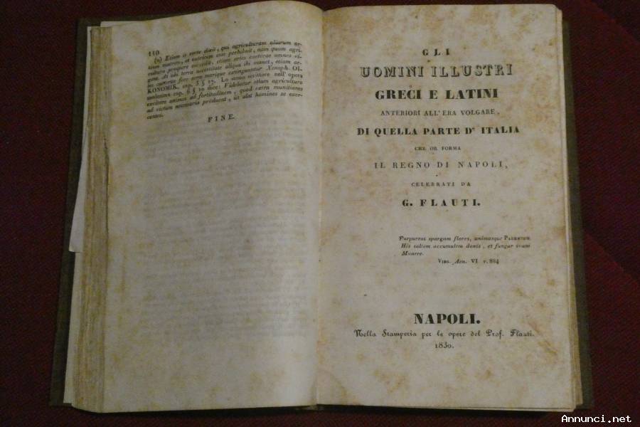 2 – GLI UOMINI ILLUSTRI GRECI E LATINI anteriori all’era volgare che or forma il regno di Napoli celebrati da R. FLAUTI. Napoli Nella stampe-ria per le opere del Prof. Flauti, anno 1830, Pagine 186