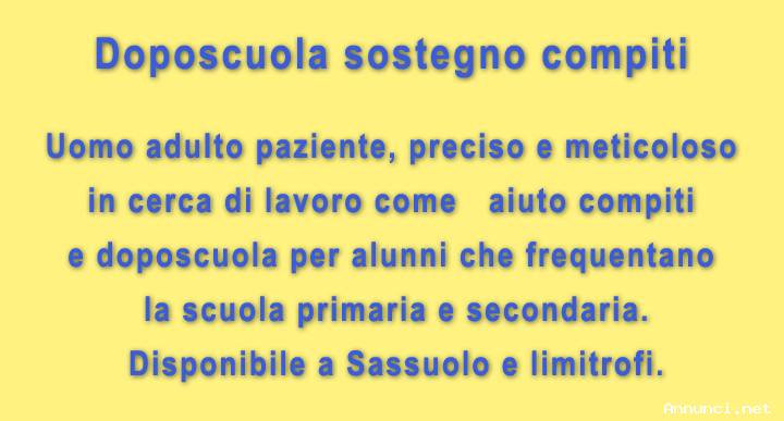 Laureato 49enne disponibile come tutor aiuto compiti per alunni della scuola primaria. Disponibile anche per insegnamento, ad alunni e minori, delll'informatica di base, uso computer e smartphone allo scopo di tutelarli dalle possibili insidie che il web e i social in particolare possono nascondere.
